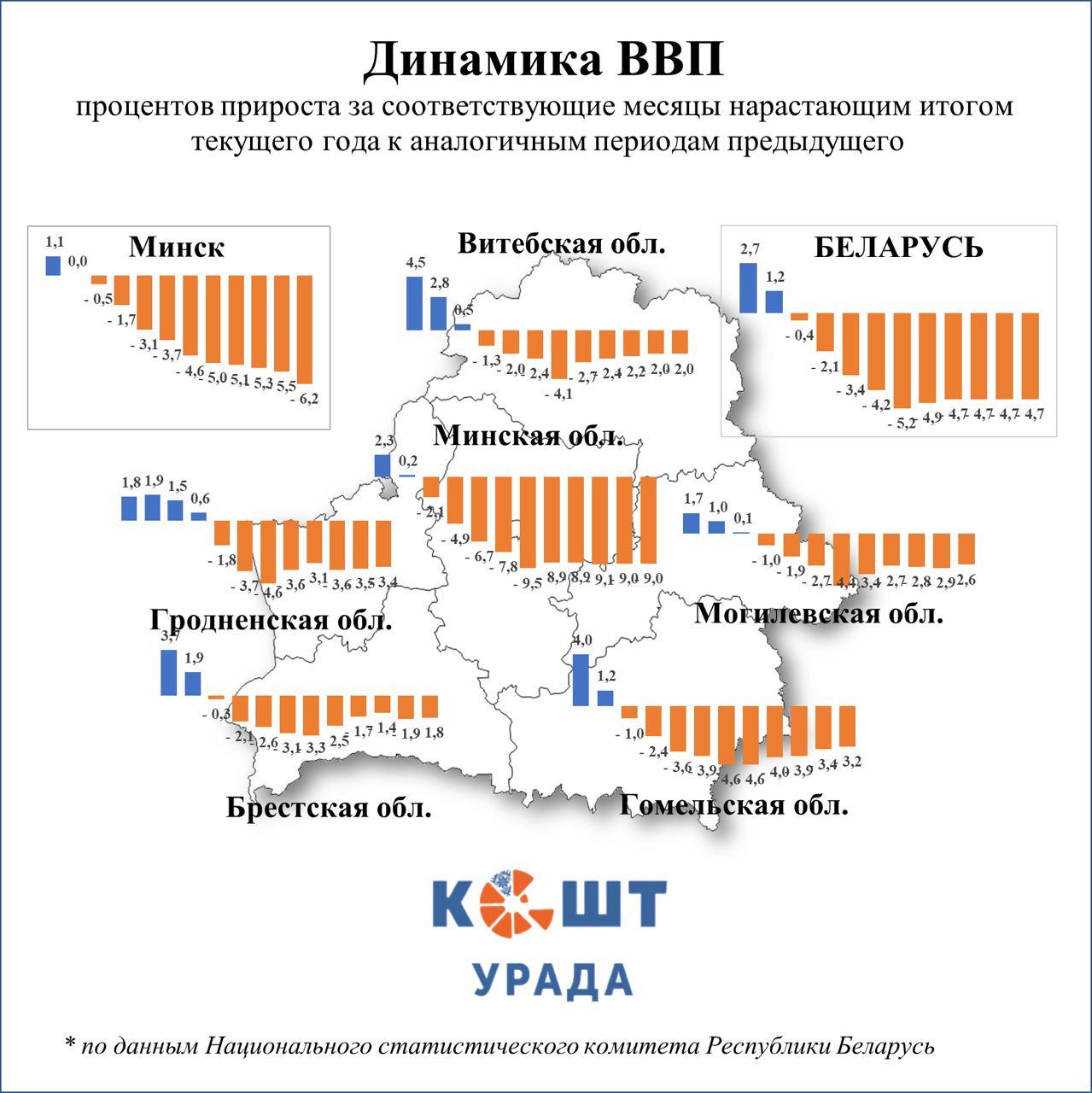 За двенадцать месяцев ВВП Беларуси составил 191,4 млрд рублей, из которых 49,6% – товары и услуги, произведенные в столице и Минской области. Эти без преувеличения локомотивы национальной экономики продемонстрировали наиболее глубокий спад в течение прошлого года. По итогам 2022 года снижение экономики в Минской области составило 9,0%. Хотя в середине года показатель достигал 9,5%. Экономика столицы упала по итогам декабря на 6,2%, что стало худшим показателем за 12 месяцев. Месяцем ранее спад был 5,5%.