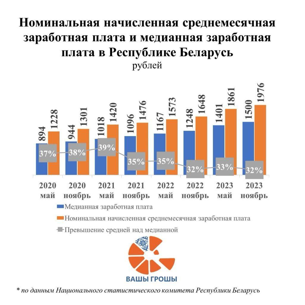 В ноябре 2023 года медианная ЗП в Беларуси составила 1500 рублей. При этом средняя номинальная заработная плата в тот же период составила 1976 рублей. Выходит, средняя номинальная зарплата сейчас на 32% выше медианной.