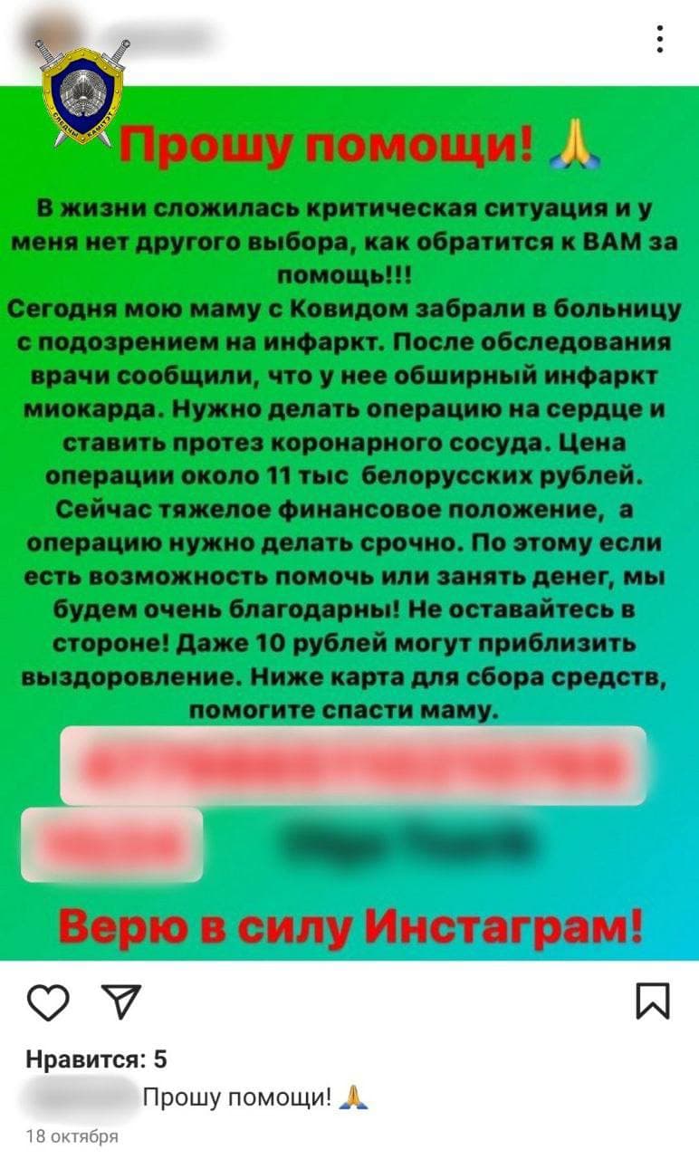 После этого 18 октября 2021 года от имени женщины злоумышленник разместил на ее странице в Instagram сообщение с просьбой оказать материальную помощь на лечение умирающей матери и перечислить деньги на банковский счет.