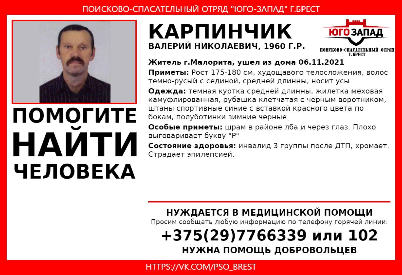 Разыскивается без вести пропавший Карпинчик Валерий Николаевич, 1960 г.р., житель г. Малорита Брестской области.